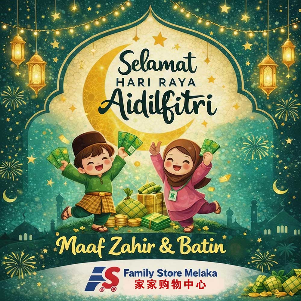 ๐โจ Selamat Hari Raya Aidilfitri dari Family Store Melaka! โจ๐โ Semoga Syawal ini membawa kegembiraan, keberkatan dan kebahagiaan bersama keluarga tercinta ๐โ Maaf Zahir & Batin ๐โจ #SelamatHariRaya #Aidilfitri2026 #FamilyStoreMelaka #RayaBersama #MaafZahirBatin