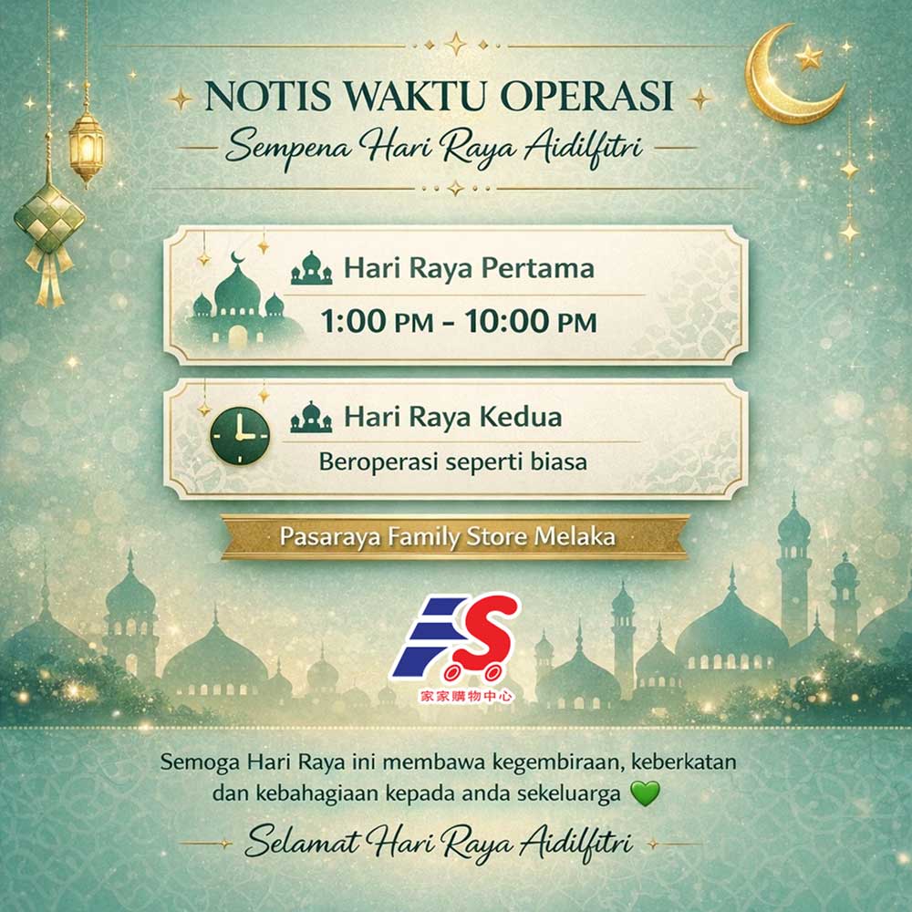 โจ Notis Waktu Operasi Sempena Hari Raya Aidilfitri โจโ Sempena Hari Raya Aidilfitri, kami ingin memaklumkan perubahan waktu operasi Pasaraya Family Store Melaka seperti berikut:โ ๐ Hari Raya Pertamaโฐ Dibuka dari 1pm hingga 10pmโ ๐ Hari Raya Keduaโฐ Beroperasi seperti biasaโ Semoga Hari Raya ini membawa kegembiraan, keberkatan dan kebahagiaan kepada anda sekeluarga ๐โ Selamat Hari Raya Aidilfitri ๐
