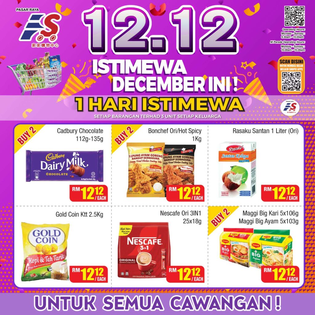 Promosi RM12.12 untuk 1 hari sahaja di semua cawangan. Barang dapur & makanan best-best semua harga cun – jangan lambat, stok cepat habis!